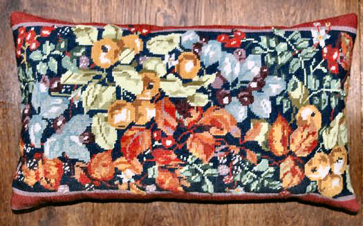 Dit kussen is met wol op stramien geborduurd.Het patroon