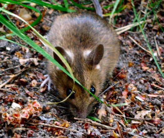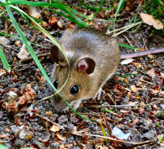 Dit muisje eet alle restjes voer op wat de vogeltjes laten liggen