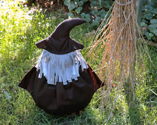 De snor is van raffia gemaakt en het halsbandje is van leer