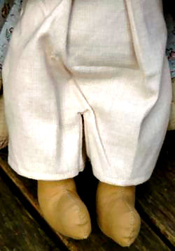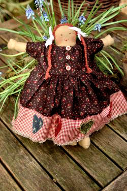 Het lijf en de beentjes van de pop zijn van stof gemaakt en