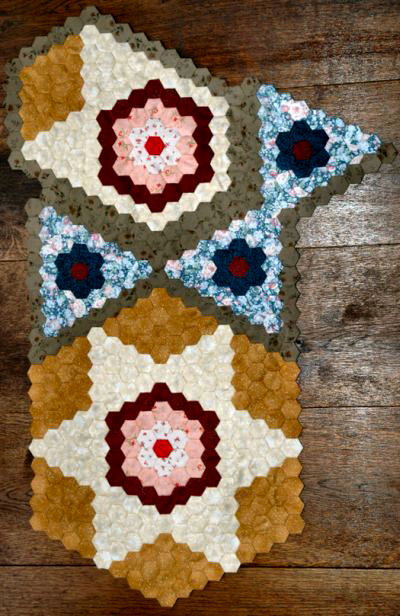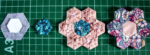 stof, kartonnetjes, garen en een naald mee. Dan maak ik alvast een stapeltjes zeskantjes.