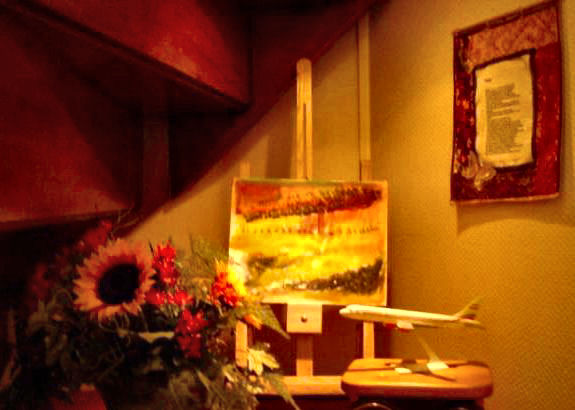 De stoof die nog net te zien is, heeft mijn vader gemaakt en het schilderijtje heeft
