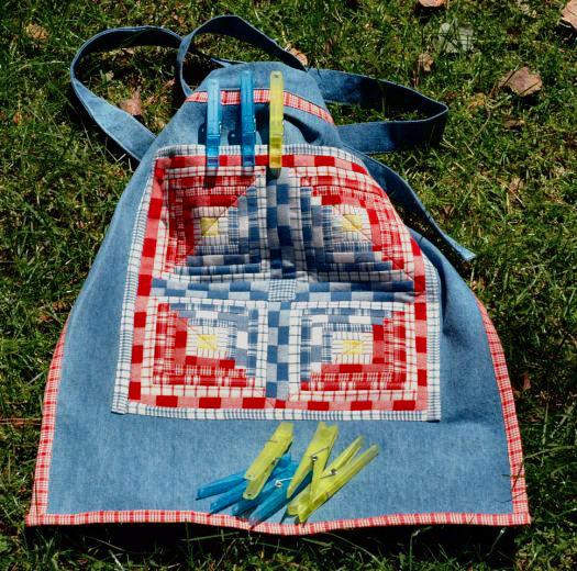 Het schortje is van spijkerstof gemaakt en het patroon is in logcabin